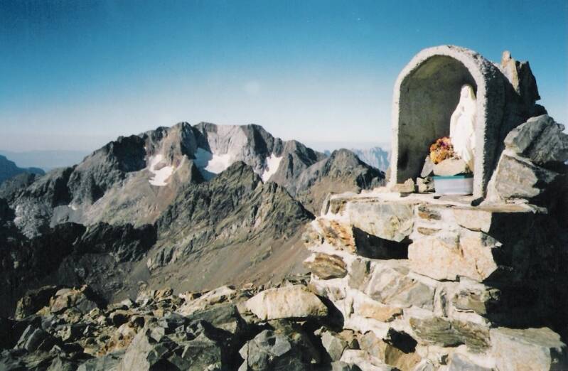 A partir de este punto la pendiente se suaviza. Atravesando un par de pequeñas brechas, ahora por fácil camino, llego en poco tiempo hasta la cumbre cimera del Gran Facha (3.005 mts.). Tiempo total de ascenso hasta la misma unas 3 horas. En la cima, una imagen de la Virgen, situada en el interior de una pequeña capilla, me da la bienvenida.