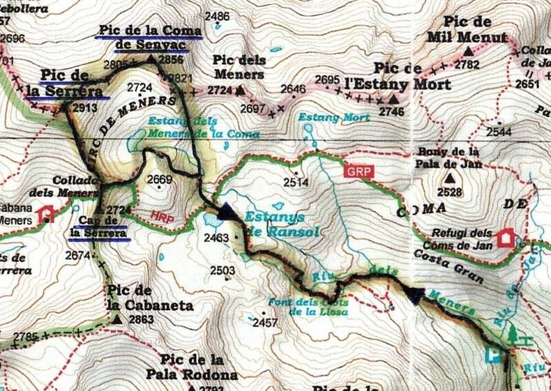 Regreso a la Collada dels Meners y comienzo, después, a descender en dirección este por una ladera fácil de rocas, con algunos tramos herbados. Tras seguir un rato el sendero GRP, que desciende hacia el sur en dirección a los Estanys de Ransol, dejo el mismo y prosigo hacia la izquierda en franco descenso hacia el Estany dels Meners de la Coma. El descenso, por graderíos de hierba con algunas piedras, es muy sencillo. Llego, más abajo, a la zona delantera del lago, desde la cual una torrentera baja hacia los Estanys de Ransol. Aquí, giro hacia la derecha y comienzo a bajar, casi siempre cercano a la torrentera, hasta encontrar de nuevo el sendero GRP y el primero de los lagos de la zona de Ransol. Atravieso la zona lacustre, desciendo por la canal por la que también desciende el río, llego a la Font de la Llosa y continuo resiguiendo el Riu dels Meners hasta que llego a la zona de aparcamiento, tras casi 2 horas de descenso. Cojo el coche y regreso.
