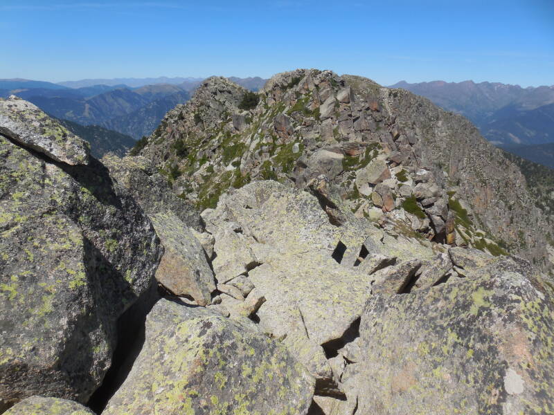 Prosigo de frente, en descenso. Al cabo de un rato llego a la punta oriental de la zona cimera. Continuo de frente y, al rato, unos hitos me llevan, en descenso y por una zona algo complicada, hasta una brecha. Frente a mí está ahora una zona de cresta muy estrecha, la conocida como Caser dels Pans, que parece algo difícil. Por suerte encuentro una serie de hitos que me permiten evitar la misma. Comienzo un flanqueo por zona de rocas y hierba por la vertiente este de la sierra, descendiendo bastante. Más abajo avanzo por un tramo algo descompuesto, por el cual tengo que ir con cuidado. Al final comienzo a subir de nuevo, usando las manos en algún tramo, hasta alcanzar una profunda brecha. Desde la misma prosigo por una cornisa rocosa hasta llegar de nuevo al filo de la cresta. Unos tramos algo aéreos por la zona final del cresterío me llevan hasta la cima del Pic dels Agols (2.648 mts.). Casi una hora desde la cima anterior.