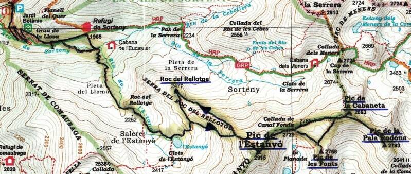Desciendo por el mismo sitio y comienzo a subir de nuevo, en dirección ahora otra vez hacia la Collada de Canal Fonda. Desde la misma comienzo el duro e inclinado ascenso que me lleva hasta las cercanías del Pic de l,Estanyó. Sin llegar a su cima, empiezo el alargado descenso de la Serra del Roc del Rellotge, por donde antes he subido. Tras un buen rato de progresión llego al punto en donde el sendero baja hacia L,Estanyol. Yo dejo el mismo y sigo de frente. Trazas de senda me llevan hacia la parte baja de la sierra. Cruzo algunas prominencias herbosas y acabo llegando a una pequeña y amplia depresión. Una subida posterior, por zonas totalmente de pastos, me lleva hasta la amplia, redondeada y verde cima del Roc del Rellotge (2.477 mts.). Unas 1,15 horas desde el Pic de les Fonts.