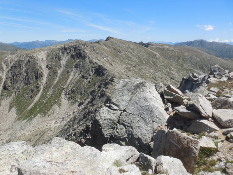 Girando hacia la izquierda, comienzo después a reseguir la parte inicial de la sierra de las Crestes del Gargantillar. Trazas de camino, con abundantes hitos, me encaminan, en general por la parte derecha del cresterío y sin demasiada pendiente, hacia la visible, y algo lejana todavía, cima del Alt del Gargantillar. El camino rodea sucesivas elevaciones, enlazando pequeños collados desde los que bajan inclinadas canales hacia la Coma dels Llops. Algunos tramos son algo más complicados, muy rocosos. A mi derecha tengo una vasta y bastante llana zona en la que reposan diversos lagos, como los del Gargantillar, el Estany Forcat y el Estany de l,Illa. Tras una larga andadura llego a un collado más amplio, sobre los 2.760 metros de altura, por la izquierda del cual desciende la denominada Canal Gran. Siempre por la parte derecha, dejo algunas cotas secundarias más, al tiempo que el desnivel aumenta. Sobrepaso después una elevación redondeada y otra con una enorme roca plana en su parte alta, para, posteriormente, girando hacia la derecha, realizar el último tramo de ascenso por una corta ladera pedregosa hasta alcanzar la cima del Alt del Gargantillar (2.843 mts.), también denominado Pic dels Llops, con una buena panorámica sobre el Pic d,Ensangents y el dels Pessons. Algo menos de una hora desde el Cap dels Agols.