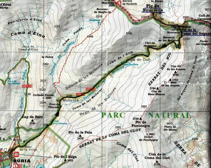 Salgo en dirección a Queralbs. Subo en el cremallera hasta Núria, a unos 1.950 metros de alto. Comienzo a caminar en dirección noreste, yendo a buscar un puente de piedra que atraviesa el torrente de la Coma d,Eina. Cruzo el puente y, al poco rato, llego a una pista que, procediendo de las pistas de esquí de Núria, sube con escaso desnivel hasta la Jaça de les Mulleres. Más tarde, hacia los 2.150 metros de altura, cruzo otro puente, éste de madera, el Pont de l’Escuder y poco rato después el camino se bifurca, sobre los 2.195 metros. El camino de la izquierda sube a través del barranco de Noufonts en dirección al collado y pico de Noufonts. El de la derecha, el que yo cojo, remonta la cuenca del torrente de les Mulleres, en dirección al collado de Noucreus. Cruzo todo el rato por el medio de agradables pastos, y veo de vez en cuando algunos animales paciendo tranquilamente. Después de un buen rato de subida llego a las inmediaciones de la Font d’en Guillém, a 2.475 metros. Sigo el torrente, ahora entre tierra y pedregales, y, poco a poco, las surgencias de agua tienden a desaparecer. Cada vez estoy más cerca de la base del collado de Noucreus, y a punto de llegar a la parte alta del cresterío.