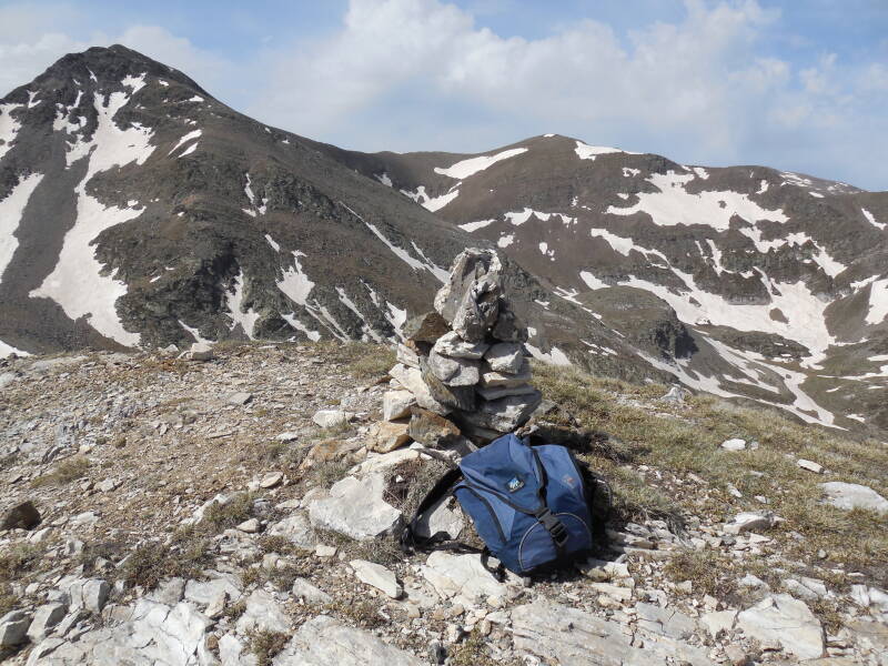 Desde aquí, a unos 2.650 metros de altura, sigo de frente y hacia la izquierda, entrando en territorio francés y faldeando la parte oeste del Noufonts. Tengo que llegar al cresterío que desciende de dicho Noufonts para comenzar mi itinerario en busca de los dos picos a los que quiero llegar. Después de faldear durante unos veinticinco minutos la cresta llego a un pequeño colladito, el Coll d,en Bernat, sobre los 2.630 metros de altura, a partir del cual comienza la denominada Cresta de l,Anyeller. Vista de lejos, la cresta parece facilona y divertida. Pero pronto averiguaré que, aunque sí es bastante divertida, facilona no es el adjetivo que más correctamente puede explicar la travesía que pretendo efectuar. Al principio comienza estrecha y suelta, pero de fácil andadura. Incluso en algún tramo se puede obviar por alguno de sus costados, siguiendo unos precarios rastros de senda. Pronto llego a un roquedo blanquecino, después del cual encuentro un descenso bastante inclinado y suelto. Poco a poco, con paciencia, desciendo hasta un pequeño colladito después del cual tengo que volver a trepar. Ahora camino por un tramo muy estrecho, con bastante patio a los lados, pero que tiene fáciles agarres y no supone mucho contratiempo. Lentamente voy progresando en dirección al Pic de l,Anyeller, ya sin demasiadas complicaciones más. Después de un fácil cresteo inicio una breve subida que me deposita en la amplia cima del Pic de l,Anyeller (2.635 mts.), cima formada por dos pequeños promontorios en uno de los cuales están algunas piedras colocadas a modo de hito cimero. He tardado unas 2 horas hasta el mismo.