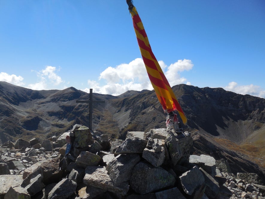 De nuevo comienzo a caminar, aun por terreno del mismo estilo que hasta ahora, pero cada vez abundando más el pedrerío, y encontrándome dos o tres prominencias intermedias, con sendos hitos en su parte superior, que tengo que atravesar. Poco a poco, con moderado desnivel, me voy acercando a una especie de antecima, ésta con un hito de mayor tamaño. A partir de aquí, la amplia y redondeada loma se transforma en cresta, cada vez más estrecha y recortada. En algún tramo se puede soslayar por su izquierda, pasando un poco por debajo de la misma, pero, a pesar de todo, con algunas dificultades. Con cuidado, excepto en un lugar donde hay un cortado desde el que desciende una vertical canal y en el que hay que bajar un poco para cruzar la misma y subir por el otro costado, la cresta es factible casi en su totalidad. Cerca del final, un pequeño hito me marca un corto desvío, también por la izquierda, para superar un resalte muy afilado. Enseguida, vuelvo sobre la misma, llegando en unos pocos minutos a la cima del Roc del Boc (2.772 mts.). Tiempo total hasta el mismo, unas 3,15 horas. Adornan esta cima una bonita cruz de hierro, una bandera catalana y un pequeño buzón metálico.