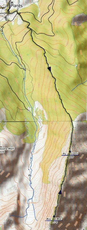 En este punto abandono el GR, que comienza a remontar en dirección hacia la izquierda, y prosigo unos pocos metros hacia la derecha, justo hasta una parte rocosa muy ancha por donde comienzo a subir. Es la parte baja de la denominada Serra de l,Escaldat que, a partir del Pic de l,Orri y hasta el Roc del Boc, toma el nombre de Serrat de les Esques. Al cabo de unos pocos metros comienza un ancho sendero, algo difuminado por la cantidad de plantas que lo van invadiendo pero fácil de seguir, que empieza a remontar el cordal de la montaña, subiendo con fuerte desnivel, sin tregua ni descanso alguno. De vez en cuando encuentro algunos hitos, bastante separados entre sí, y pequeñas marcas de pintura roja, pero el camino, de momento, no tiene pérdida. Después de subir un desnivel aproximado de doscientos metros y en una zona donde la inclinación mengua un poco, encuentro un cruce en el que podría seguir de frente por llano camino, o subir hacia la derecha, de nuevo con mucha inclinación. Como sé que tengo que reseguir todo el rato el cordal, me desvío hacia la derecha.