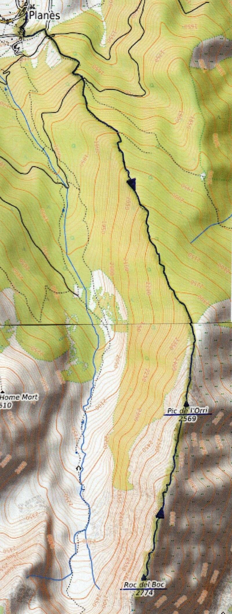 Lo hago y bajo un buen trecho, lo suficiente para acercarme al famoso paso, pero una canal anterior, delicada y muy vertical, me impide llegar a la base del mismo. Ya con todo este lío, y teniendo en cuenta que no quiero pecar de inconsciente, decido desistir de mi idea de bajar al collado de Malaza y opto por la única solución posible, volver a subir hasta la cima del Roc del Boc y regresar a Planès por el mismo sitio por el que he venido. Y así lo hago. Remonto la lisa pared por la que he descendido hace un rato, con cuidado ya que también tiene una caída de muchos metros, y regreso a la cima de nuevo. Sin detenerme, me pongo en faena sobre el largo cresterío que tengo por delante y, ahora, intento hacer la cresta entera por encima. Muy complicada no es, pero en algún tramo es muy aérea y fina. Además, la roca no es demasiado fiable, está bastante descompuesta. Solo la abandono en el tramo donde ya al venir había encontrado el cortado vertical, donde me veo obligado a descender un poco para cruzar la canal que baja del mismo.