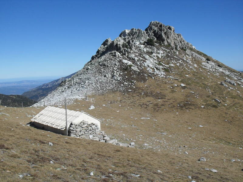 El collado de la Portella de Rojà, con su pequeño refugio del mismo nombre. Detrás, el Roc de la Portella de Rojà