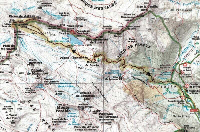 Salgo el día anterior en dirección a Bielsa, con la idea de ir a dormir a la zona de acampada del Valle de Pineta para, al día siguiente, intentar ascender los picos Astazus. Ya en dirección al valle, recorriendo durante bastante tiempo bellos parajes, y encajonado cada vez más entre montañas, llego a la cabecera del mismo, cerca del Parador Nacional de Pineta, y me desvío hacia la izquierda para acceder al lugar donde tengo que acampar. Paso la noche en la tienda, a 1.245 metros de alto, y, al día siguiente, me levanto temprano, desmonto la misma, y comienzo la ascensión. Cruzo, por un ancho camino bajo altos árboles, el resto del llano que queda hasta llegar a las paredes del circo. La vista desde la base de la muralla es espectacular. Un gran número de cascadas descienden sobre el valle. A partir de un cierto punto un cartel me indica el camino por el que debo subir. Como que es un itinerario muy concurrido, los montañeros nos mezclamos con cantidad de turistas que también exploran la belleza del lugar.
