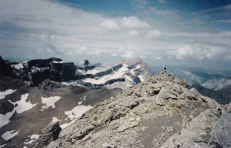 Después, prosigo de nuevo en dirección al collado de Astazu. El itinerario, marcado con hitos y ahora con escaso desnivel, atraviesa todo el Balcón de Pineta, entre canchales y grandes neveros, hasta llegar a la orilla del lago Helado de Marboré, sobre los 2.600 metros de altura. Dejo a un lado del lago la brecha de Tucarroya, con el refugio del mismo nombre colgado en su parte superior, y avanzo por una ladera de rocas y nieve en busca del collado. Después de una larga progresión por algunos neveros, pero sin necesidad de crampones en ningún momento, alcanzo el mismo, a unos 2.950 metros de alto. Desde el collado de Astazu, las vistas a cualquier lado son poco menos que espectaculares. Enfrente, el imponente circo de Gavarnie, con los picos de la Cascada, cercanos, y el Casco, la Torre de Marboré y el Taillón, más lejos. Detrás quedan las fabulosas vistas hacia el lago Helado de Marboré, a mis pies, y el Cilindro y el Monte Perdido, con sus heladas laderas, a mi derecha. Giro, después, hacia la derecha, en dirección al Astazu Occidental. Una sencilla y pedregosa cresta me conduce, en pocos minutos, a la cima del Astazu Occidental (3.012 mts.). La subida hasta aquí me ha llevado casi 4 horas.
