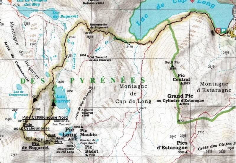 Atravieso, después, el torrente que forman las aguas que se desprenden del mismo en dirección derecha y comienzo a subir por una verde loma, por camino marcado con hitos, que me llevan al encuentro del camino correcto que sube desde el lago de Bugarret. Pronto llego a la altura del lago Tourràt, que aparece ante mí de un azul pálido, majestuoso, con algunos neveros en la parte opuesta, justo debajo del Pic Long. Al otro lado del lago, la cresta norte del Pic Long, el Pic Maubic y la Aguja Tourràt forman un paredón que cae casi verticalmente sobre el mismo. Ahora, giro hacia la izquierda comenzando a remontar la vertiente cada vez más pedregosa que, bordeando la orilla derecha del lago Tourràt, va ascendiendo lentamente, sin demasiados hitos aunque con poca posibilidad de pérdida, hacia las estribaciones noreste de la Pale Crabounouse Nord, que no se deja ver hasta que estás ya muy cerca de la misma. A mi izquierda sí que se ven perfectamente el Dent d,Estibère Male y el Bugarret. Voy subiendo, poco a poco, acercándome al contrafuerte norte de la zona de cresta. Una corta subida me deja, enseguida, en la cima de la Pale Crabounouse Nord (3.016 mts.).