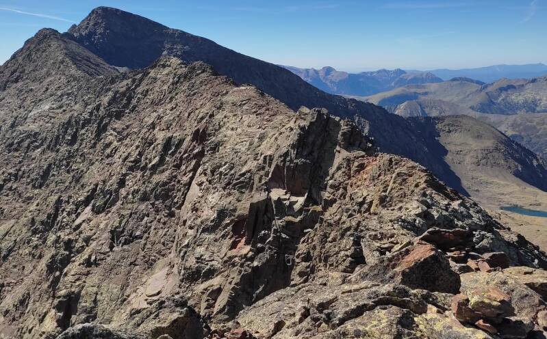 Después, emprendo la travesía por toda la cresta hasta el Abeillé. Una vez llego de nuevo a la brecha por la que he subido, atravieso dos cotas secundarias para llegar en unos 15 minutos a la Punta de Ibón (3.100 mts.). La cresta se vuelve ahora más agradable y menos complicada. Tras salvar otra pequeña depresión, sobre los 3.035 metros, llego fácilmente a la cumbre del Pequeño Bachimala (3.061 mts.). Ya en dirección al Marcos Feliu, la cresta se vuelve de nuevo más recortada, aunque prácticamente sin dificultad. Llego al pico Marcos Feliu (3.057 mts.) tras unos 50 minutos de paseo por la cresta. Continuando por grandes bloques y atravesando la depresión que tiene menos altura de todo el cresterío, 2.998 metros, también sin grandes dificultades, llego, en unos 15 minutos más, hasta el Abeillé (3.029 mts.). El Abeillé conforma un nudo de aristas desde el cual la vista es espléndida por todos los lados. Girando hacia la izquierda podría dirigirme hasta el pico del Puerto de la Pez. Pero, como que ya había leído que en la cresta hasta éste hay algunos pasos muy delicados, opto por descender en dirección sudoeste hacia la cuenca de los ibones de Bachimala, que veo a mis pies. Ya al costado de los ibones, paso cerca de la canal de ascenso al pico De la Pez. Pero es tarde y lo dejo para otro día. Bordeando uno tras otro los ibones de Bachimala me dirijo hacia el más bajo de los mismos e inicio el regreso por el mismo camino de subida. Atravieso el contrafuerte oeste del Gran Bachimala, reencuentro el camino de bajada del collado de la Señal de Viadós, llego al Vado de Bachimala, a la cabaña de Culrueba y, en unos minutos, alcanzo de nuevo el refugio de Tabernés. Casi 3 horas de descenso. Descanso un poco, cojo el coche y vuelvo para casa.