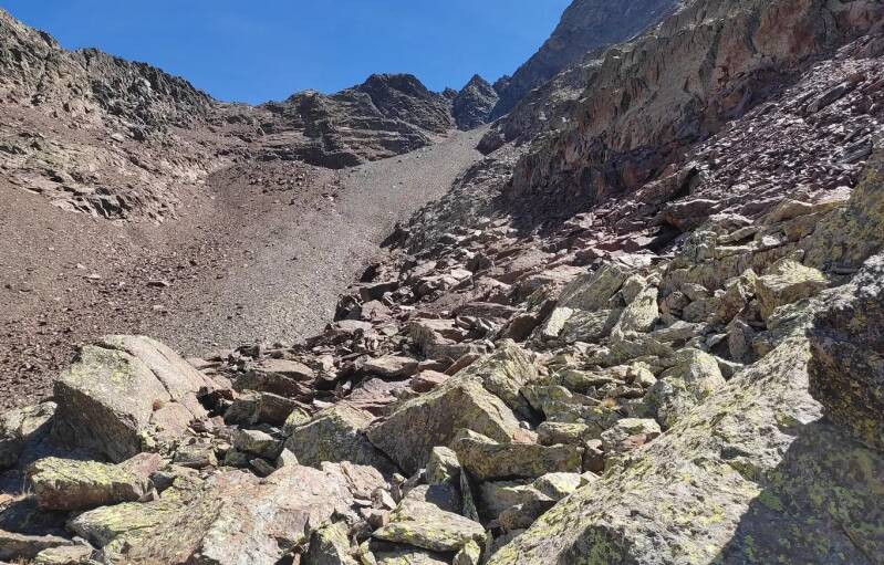 Después, los hitos se van sucediendo más o menos alejados. Atravieso el contrafuerte y, llaneando a bastante altura por encima de la Bal de la Pez, me dirijo hacia los ibones de Bachimala. Alcanzo el primero de los ibones, el Ibón Inferior de Bachimala, situado a unos 2.560 metros, y lo rodeo por su izquierda. Después, subiendo cerca del torrente que une el Ibón Superior de Bachimala con el ibón Inferior, rodeo también el Ibón Superior de Bachimala por su izquierda, y me dirijo completamente al este en busca de las amplias y verticales pedreras que bajan del cresterío de Bachimala. La subida es imponente. El camino desaparece. Remonto, no sin ciertas dificultades, el solitario pedregal, buscando lo que se intuye como un paso entre la Punta del Ibón y la Punta Ledormeur. Antes de llegar me tropiezo con algún trozo de ladera nevado que, por suerte, no tengo que pisar. Después de un punto en el cual mengua algo la pendiente, voy a buscar una especie de canal hacia la derecha, la cual me conducirá hasta el lomo del cresterío. Voy a salir al mismo entre las dos puntas, la del Ibón y la Ledormeur. Yendo de nuevo, ya por la cresta, hacia la derecha, alcanzo en unos 5 minutos la cumbre de la Punta Ledormeur (3.120 mts.). Tiempo hasta ahora, 2,45 horas.