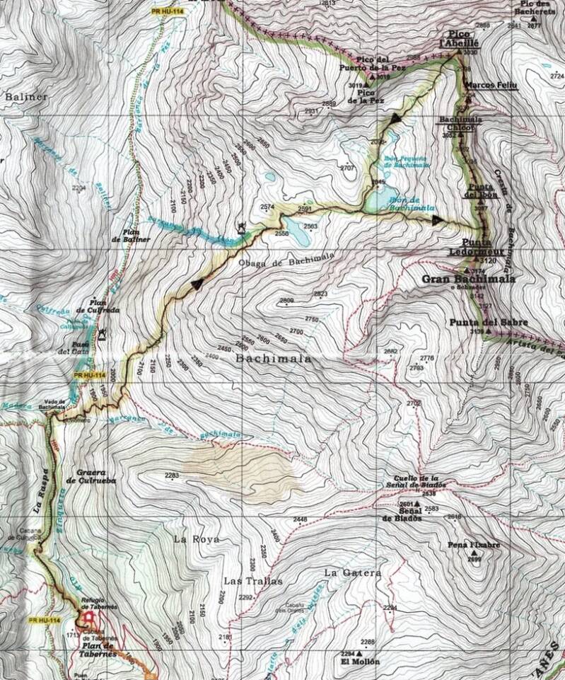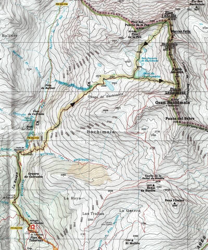 Paso la noche en el refugio libre de Tabernés, a 1.740 metros de altura. A la mañana siguiente me levanto temprano, atravieso el barranco por un puente que tiene una puerta para el ganado y voy subiendo dicho barranco por su margen izquierda, comenzando a remontar la Bal de la Pez. Paso junto a la cabaña de Culrueba, sobre los 1.790 metros, y, por camino bastante llano, llego en poco rato al Vado de Bachimala, a unos 1.800 metros de altura. A partir de este cruce de aguas, giro a la derecha, paso otro puente sobre el torrente que atraviesa la Bal de la Pez y, dejando a la izquierda el camino que seguiría el valle hasta el collado de la Pez, remonto, pasando al lado de un pluviómetro, el barranco de Bachimala.