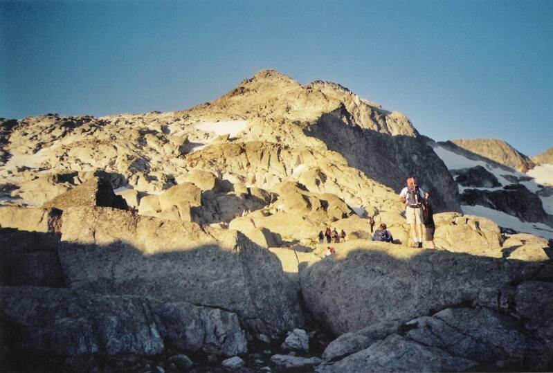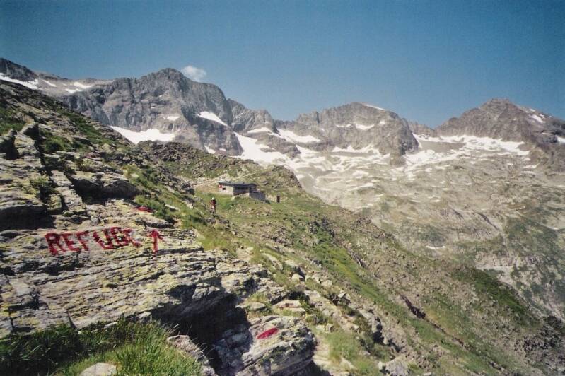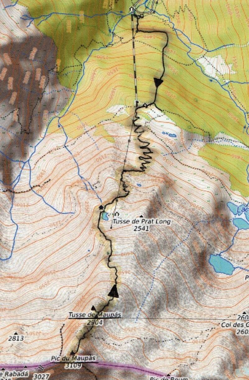 Una vez he llegado a este lugar ya se ve próximo el refugio. Desciendo un poco y, en seguida, paso cerca del pequeño Lac d'Enfer, llegando al poco tiempo al refugio de Maupàs, a 2.430 metros de altura. Al día siguiente comienzo temprano la subida al Maupàs. Bordeo el Lac d'Enfer, llegando al rellano donde finaliza el teleférico. Después, subo penosamente en dirección sur hasta el contrafuerte que baja de la cumbre. Siguiendo los hitos que me van marcando el camino, subo a ratos por terreno herboso y a ratos por pedregales, hasta superar el pequeño promontorio de la Tusse de Maupàs (2.900 mts.), llegando a un rellano a partir del cual el cresterío se torna más vertical. Comienzan a verse algunos trazos con nieve, pero cruzarlos no es imprescindible. Al encontrar un resalte, lo subo por la misma cresta sin demasiadas dificultades. Siguiendo por el filo de la arista asciendo sin ninguna clase de problema, llegando en poco rato a la cumbre del Maupàs (3.109 mts.). Tiempo total de subida, sobre las 3,45 horas.