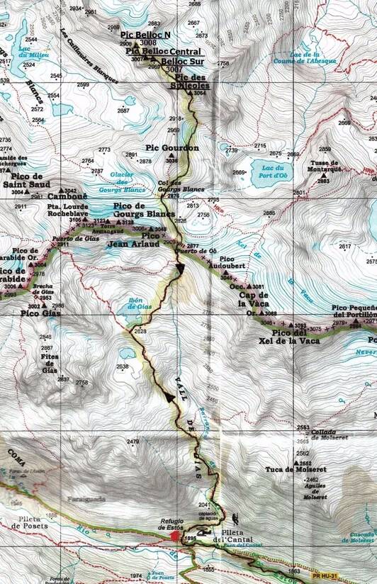 Después, consciente de todo lo que me queda para regresar al refugio de Estós ya que estoy muy lejos del mismo, no pierdo demasiado tiempo y emprendo el camino de regreso hacia el Espijeoles. Rehago el camino por las 3 cimas Belloc hasta que llego de nuevo a la brecha menos elevada del cresterío. Desde aquí comienzo a subir fácilmente el centenar de metros de desnivel que me separan del Espijeoles. Ahora, inicio la bajada de la canal que me ha de dejar en la fácil ladera de descenso hacia la brecha de Espijeoles. Atravieso de nuevo la suelta canal que baja de la brecha y realizo otra vez el flanqueo del Gourdon, siguiendo los hitos que de vez en cuando voy encontrando. A pesar de estar avanzado el verano algunos pequeños regueros de agua se escurren por las oscuras rocas. Voy siguiendo en dirección al Puerto de Gourgs Blancs y, después de atravesarlo, sigo decididamente en dirección al Puerto de Oô. Como que tengo perfectamente estudiado el punto de bajada, ahora no tengo ninguna duda y emprendo el descenso del mismo en dirección al valle de Gías. Tras haber subido varias veces por este valle, y a pesar de haber seguido siempre rastro de hitos, creo que ninguna de las veces he realizado el mismo camino. Unas veces más hacia la derecha, otras veces más hacia la izquierda, pero al final siempre voy a parar a las cercanías del Ibón Superior de Gías. Sigo descendiendo por la pendiente ladera hacia los ibones inferiores y, pasando algo lejos de los mismos, me dirijo hacia las cercanías del torrente que baja hacia el valle de Estós. Cruzo, como es obligado, el mismo en dos ocasiones, hasta que alcanzo a ver ya la silueta del refugio. Llego al refugio de Estós y comienzo el descenso hacia el coche. Bastante abajo veo que tienen material preparado para cambiar la vieja pasarela de maderas sobre el torrente de Batisielles por una de vigas de hierro y piso metálico. No se si esto es bueno o malo, ya que el valle puede perder poco a poco su encanto, pero habida cuenta de la cantidad de gente que transita por el mismo, y que hay muchos que no son montañeros sino sólo turistas de montaña, es posible que valga la pena que esté un poco más arreglado. Con estos pensamientos llego hasta la fuente de Coronas. Después sigo bajando, atravieso la cabaña de Santa Ana, cruzo el puente de Aiguacarí y, poco a poco, me voy acercando al aparcamiento, al que llego tras unas 3 horas de vuelta. Ya en el mismo, cojo el coche y emprendo el viaje de regreso.