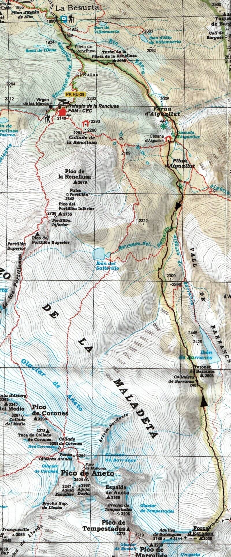 Para el regreso observo que, más a mi izquierda, un pequeño canalón me permite descender hasta otra brecha, justo al lado contrario de la anterior, y casi que con más facilidad. Bajo hasta esta brecha y comienzo a descender hasta la base del cresterío. Voy siguiendo los hitos de bajada y, en lugar de ir hacia la derecha por donde he subido dando un pequeño y fácil rodeo, éstos me llevan directamente al canalón que había visto ya cuando subía. Viendo desde arriba que no parece muy complicado, intento descender por el mismo. No es complicado pero está muy, muy descompuesto. Tengo que bajar con mucho cuidado. Llego por fin a la base y creo que he ganado algo de tiempo. Cruzo de nuevo el pequeño nevero que ya había pisado antes en la subida y retorno al inicio del espolón que me ha de conducir hacia la parte más baja y pedregosa de las laderas del glaciar de Tempestades. En todo momento tengo frente a mí la azulada masa del lago de Barrancs, justo al lado del promontorio que lo separa del collado del mismo nombre. Llego de nuevo bajo el corto y ancho canalón por el que he de subir otra vez al collado de Barrancs. Inicio el pequeño ascenso y, después, prosigo bajo las estribaciones finales del glaciar de Aneto en dirección a la loma por la que he de bajar para retornar al cauce del torrente de Barrancs. Desciendo hasta dicho torrente y deshago el camino a lo largo del mismo para llegar al cabo de un cierto tiempo a las cercanías del Plan de Aigualluts. Reencuentro la pequeña canal de entrada, bajo por la misma y llego en poco rato a los enormes y verdes llanos donde el torrente se remansa para caer de nuevo al otro costado de los mismos por el agujero en el que se sumerge y desaparece momentáneamente, el bonito y casi mágico Forau de Aigualluts, en el que hay mucha gente disfrutando del paraje. Prosigo hacia La Besurta, donde llego tras unas 3 horas de descenso. Al rato, cojo el autobús que me ha de llevar hasta los Llanos del Hospital donde tengo el coche. Comienzo, después, el regreso a casa.