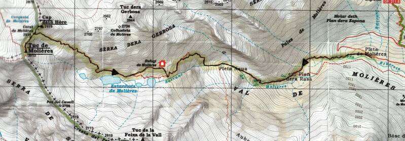 Desde sus cercanías, por un sencillo sendero accedo a un promontorio en el que está asentado el pequeño refugio de Mulleres, a unos 2.360 metros. Es éste un precario refugio, sin mucha capacidad, pero situado en un mirador privilegiado y muy útil en determinadas circunstancias. Al rato, continúo. Prosigo, resiguiendo el barranco por su orilla derecha, buscando los hitos que entre grandes rocas me marcan el camino. La pendiente va acentuándose poco a poco. Sobrepaso el Estany Superior de Mulleres, que conserva a su alrededor aún bastante nieve, y me desvío un poco hacia la derecha, remontando una pedregosa ladera. Observo en el fondo del circo otro pequeño lago, también nevado, y tras él las surgencias de agua que forman el nacimiento del Noguera Ribagorzana. Ahora, la pendiente se va acentuando cada vez más. Observo los Estanys de Mulleres ya muy abajo. Encuentro a lo largo del camino los restos de algún nevero, que atravieso sin ninguna complicación. Al fondo comienzo ya a divisar el collado al que me dirijo. Un poco antes de llegar hasta el mismo tengo que superar un pequeño resalte.